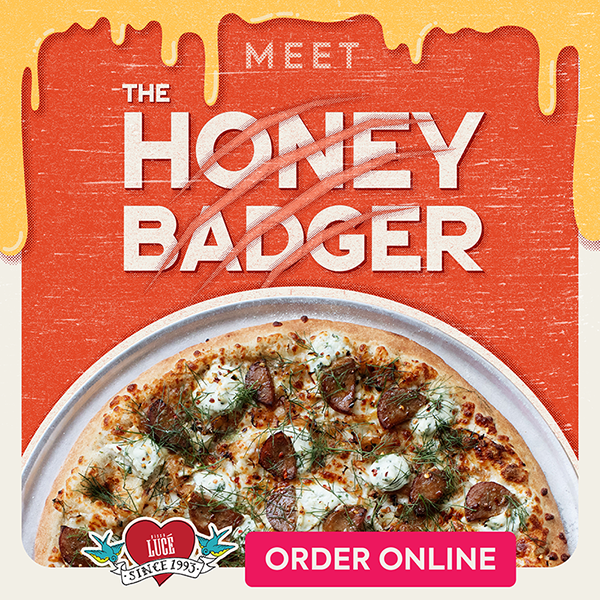 Hot-honey pork sausage, shaved fennel, caramelized onion, mozzarella, whipped ricotta, lemon olive oil, hot garlic honey on the side.